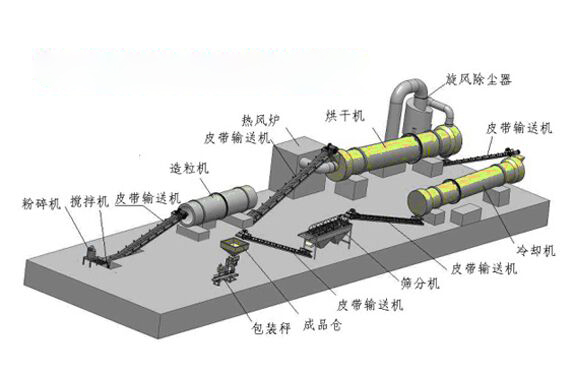 復合肥生產(chǎn)線的工藝流程通?煞譃椋涸吓淞、原料攪拌、原料造粒、顆粒烘干、顆粒冷卻、顆粒分級、成品包膜、成品包裝