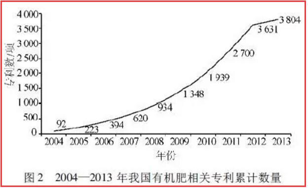 (3)我國有機(jī)肥相關(guān)專利累計(jì)數(shù)量呈現(xiàn)上升趨勢(圖 2),表明我國有機(jī)肥生產(chǎn)技術(shù)在迅速進(jìn)步和發(fā)展。