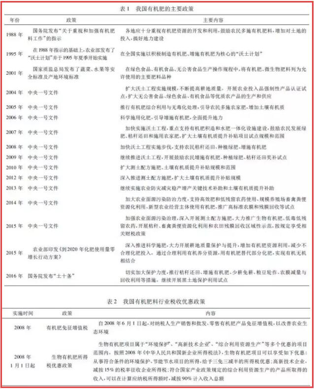 政策可以引導(dǎo)行業(yè)發(fā)展。近年來,中央高度重視有機(jī)肥的施用情況,要求各地大力推廣施用有機(jī)肥。2004—2016 年,連續(xù)13 年發(fā)布以“三農(nóng)”為主題的中央一號文件,強(qiáng)調(diào)了“三農(nóng)”問題在中國社會主義現(xiàn)代化時(shí)期“重中之重”的地位,有機(jī)肥作為農(nóng)業(yè)生產(chǎn)的重要環(huán)節(jié),除2011 年以外,12 次被納入歷年中央一號文件作為未來產(chǎn)業(yè)發(fā)展的重點(diǎn)。我國有機(jī)肥的主要政策和有機(jī)肥行業(yè)稅收優(yōu)惠政策分別見表 1 和表 2。